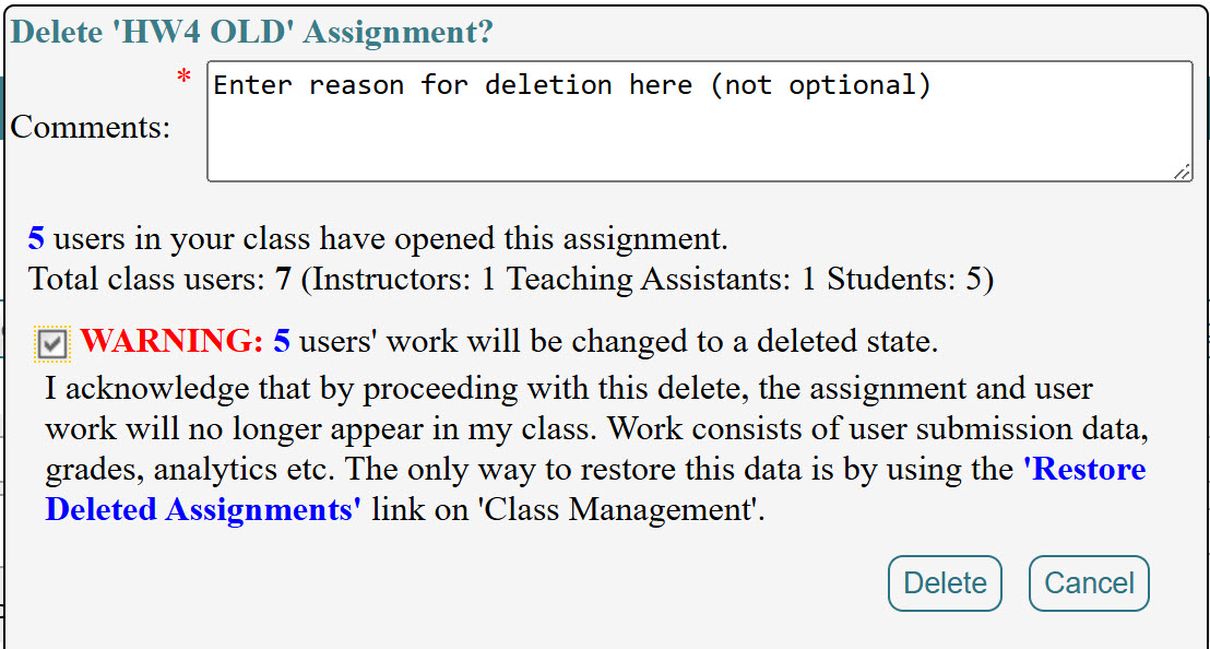 If students have submitted work for the assignment, the warning message will indicate how many students have submitted. Enter at least one character in the required Comments box and select the checkbox to confirm that the assignment and student work will no longer appear in your class. Once the checkbox is selected, the Delete button will become active. Click Delete to proceed with deleting the assignment, or click Cancel to abort.