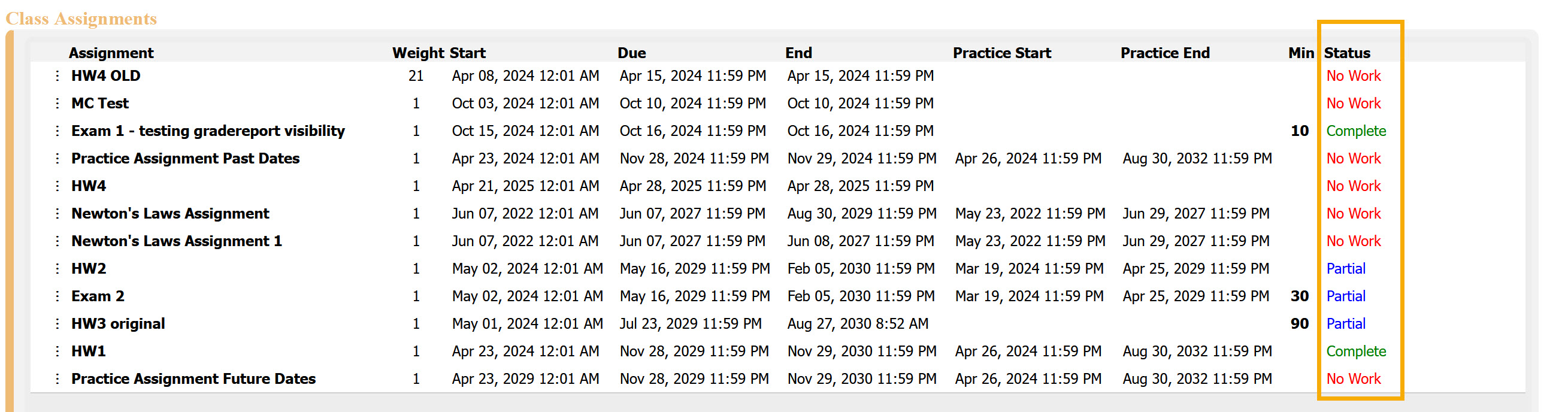 Assignment Status shows the progress of each assignment in your class.