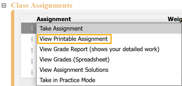 To access it, click on the assignment name or the three vertical dots next to the assignment name to open the Assignment Menu. From the menu, select View Printable Assignment.