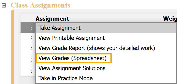 The View Grades (Spreadsheet) option lets you see your grades for an individual assignment in a spreadsheet format. This view shows your grade for each problem and problem part, rather than just the overall assignment grade.