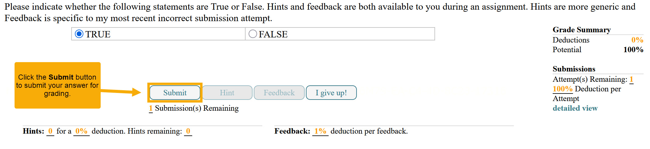 Important: Using I give up! will automatically reveal the correct answer and apply a 100% deduction for that problem or problem part.