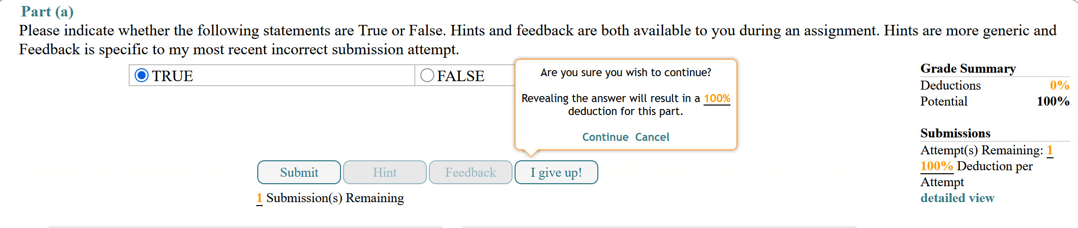“Are you sure you wish to continue? Revealing the answer will result in a 100% deduction for this part.”