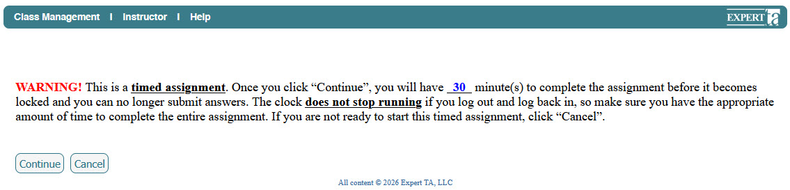 “This is a timed assignment. Once you click ‘Continue’, you will have [time] minutes to complete the assignment before it becomes locked and you can no longer submit answers. The clock does not stop running if you log out and log back in…”