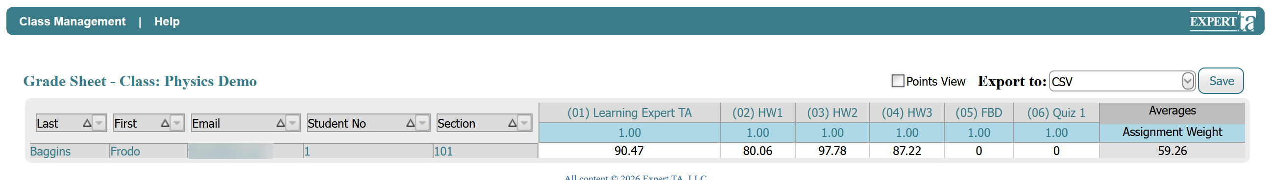 On the next screen, you will see your class grade sheet, which includes a list of all assignments in your class along with your overall average. Clicking on an assignment name will open a detailed view showing your grades for each individual problem and problem part within that assignment.