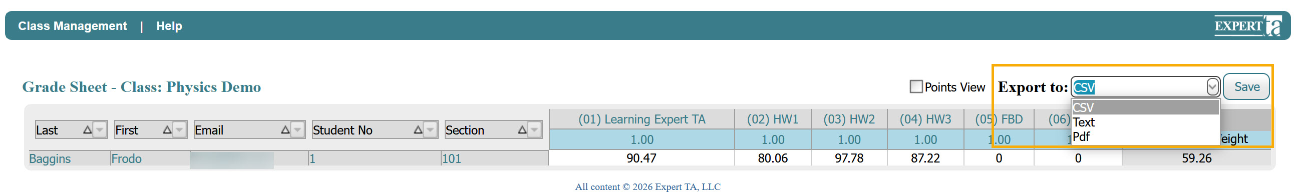 View/Manage Class Grades can be exported by selecting a file format from the Export To drop-down menu and clicking the Save button.